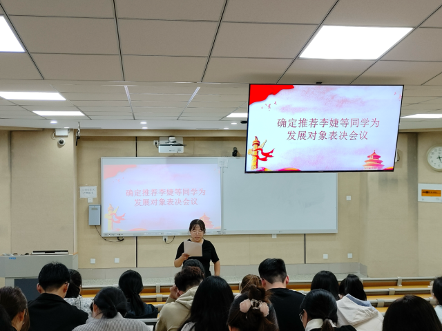 第二阶段讨论李婕等同学为发展对象的相关事宜。本次会议内容严格遵循中国共产党发展党员工作程序,根据入党积极分子的表现,与会党员进行认真讨论,并采取无记名投票的方式进行表决,最终一致同意李婕等同学为发展对象。