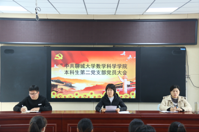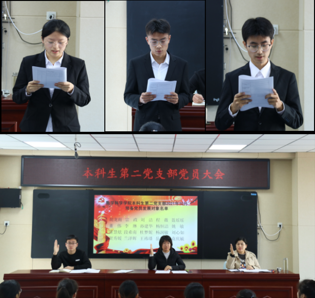 首先,由工作人员清点参会人数,宣读预备党员发展对象名单,宗政等20名预备党员发展对象依次宣读《入党志愿书》,并汇报了自己对党的认识、自己存在的不足和今后努力的方向等,并表达了自己对加入党组织的意愿。随后由入党介绍人向党支部大会介绍发展对象的情况并表明同意其入党的意见,根据支委会意见、与会人员的表决情况通过了宗政等20名同志发展为预备党员的决议。紧接着,工作人员宣读了本科生第二党支部预备党员期满转正名单,王晓等13名预备党员依次宣读《预备党员转正申请》,汇报了预备期期间在思想、学习、工作等方面的情况,根据支委会意见、与会人员的表决情况通过了王晓等13名同志按期转正的决议。