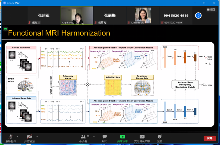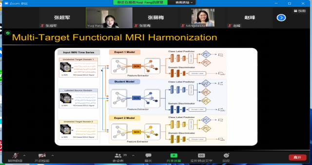 2022年3月13日(星期日)上午九点,受悟空体育智能数据分析团队邀请,北卡罗来纳大学教堂山分校房钰棋博士后在线上做了关于Unsupervised Cross-Domain Functional MRI Adaptation for Major Depressive Disorder Diagnosis 的学术报告,除智能数据分析团队的全部教师和研究生参加以外,本次会议也邀请了其他高校的老师和员工参加,在会议中师生们进行了精彩的发言讨论。