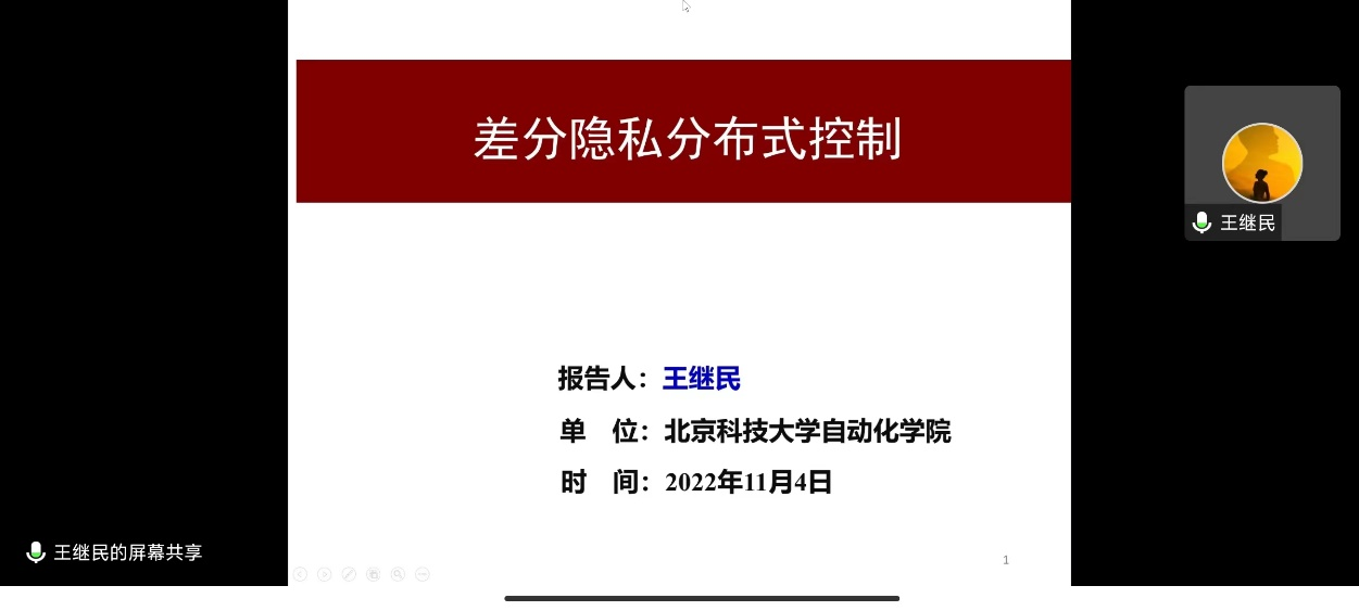 2022年11月4日(星期五)晚上19:00,悟空体育邀请北京科技大学自动化公司王继民副教授作了题为“差分隐私分布式控制”的报告。本次报告以腾讯会议的形式举行,由陈国梁老师主持,悟空体育相关专业老师和研究生在11号教学楼B207参加了本次报告。