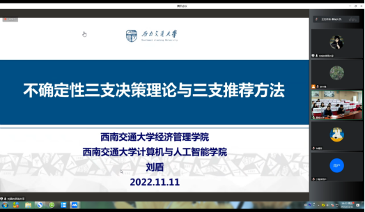 2022年11日11日,受悟空体育邀请,西南交通大学刘盾教授在线上作了题为“不确定性三支决策理论与三支推荐方法”的学术报告。此次报告由悟空体育姚炳学教授主持,不确定理论团队相关专业老师和研究生在11号教学楼B207参加了本次报告会。