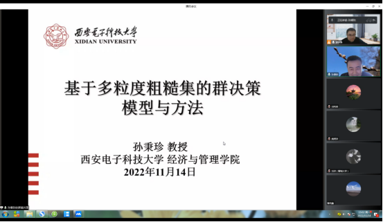 2022年11日14日,受悟空体育邀请,西安电子科技大学孙秉珍教授在线上作了题为“基于多粒度粗糙集的群决策模型与方法”的学术报告。此次报告由悟空体育李令强教授主持,不确定理论团队相关专业老师和研究生参加了本次报告会。