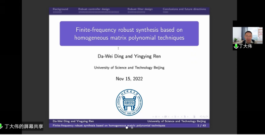 2022年11月15日(星期二)晚上19:00,受悟空体育复杂系统智能分析与控制团队邀请,北京科技大学丁大伟教授作了题为“基于齐次矩阵多项式技术的有限频域鲁棒综合问题研究”的报告。本次报告以腾讯会议的形式举行,报告由解相朋教授主持,悟空体育相关专业老师和研究生在11号教学楼B207参加了本次报告。