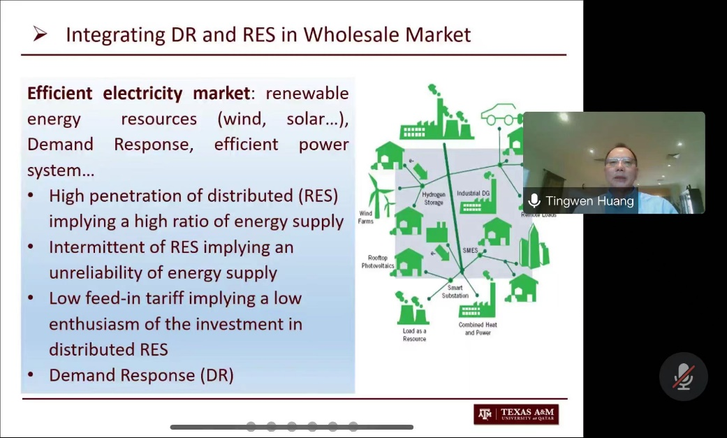 黄廷文教授报告从智能网络背景开始,围绕微电网系统多能源交易优化问题、可再生能源引入能源批发市场时情形下价格优化问题、电动汽车充电过载时电费价格优化问题、满足供电需求下发电机的总成本优化问题等4个方面做了详细介绍,并对四类问题分别给出了优化模型及优化控制策略。