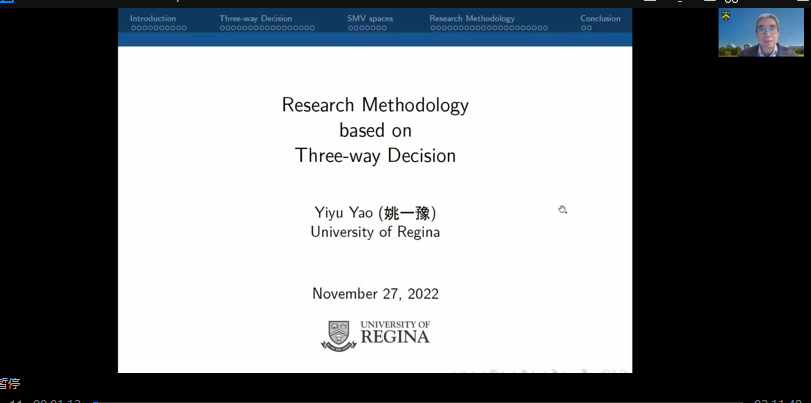 2022年11日27日,受悟空体育邀请,加拿大里贾纳大学姚一豫教授在线上作了题为“Research Methodology based on Three-way Decision”的学术报告。此次报告由悟空体育姚炳学教授主持,悟空体育、西北师范大学、重庆邮件大学和临沂大学等4所高校的30多位师生参加了本次报告会。
