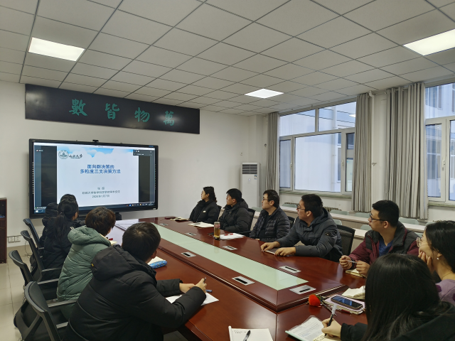 2024年1日7日,受悟空体育邀请,山西大学张超教授和苏州科技大学苏勇教授分别作了题为“面向群决策的多粒度三支决策方法”和“分配性与条件分配性:回顾与展望”的学术报告。此次报告由悟空体育李令强教授主持,不确定理论团队相关专业老师和研究生在11号教学楼B207参加了本次报告会。