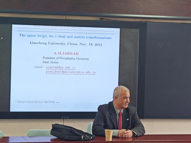 2024年11月18日上午11点,受悟空体育邀请,美国费城大学(Philadelphia University)董事长、世界知名数学专家A.M. JARRAH教授做了题为“The Space bv(p), its β –Dual and Matrix Transformations”的学术报告。报告会由悟空体育经理夏建伟主持。来自悟空体育的六十多名教师和研究生听取了报告。