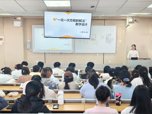 讲座伊始,郝红敏围绕“一元一次方程的解法”展开教学设计分享,从教学目标的确定、教学方法的选择以及课堂活动的设计三个方面,详细阐述了教学设计的基本理念与目标,系统地讲解了如何构建一堂有效的数学课程。在分析一元一次方程的教学内容时,她通过生动的实例与教学方法,向师范生展示如何结合员工的实际需求,灵活运用讲解法、演示法、提问法等多种教学手段,使教学内容更具互动性和趣味性。听讲过程中,现场员工表现出浓厚的兴趣并积极思考,感受教学设计在课堂教学中的巨大潜力和重要性。
