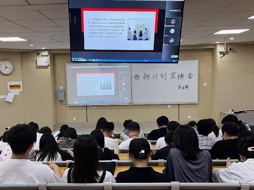 本次宣讲会采用线上直播与线下观看相结合的方式进行。活动开始,主持人从西部计划的主要服务内容和意义为同学们简单介绍了本次宣讲会的主要内容。宣讲人刘仁义围绕2023年西部计划整体概况、激励和保障政策、招募流程等内容进行详细的介绍和解读,并对乡村教育、服务乡村建设、健康乡村等7个专项作重点讲解。随后,他结合自身生活工作的实际情况,和同学们分享了自身志愿初衷、他奉献西部遇到的感人事迹和在宁夏乡镇的生活趣事,呼吁青年学子怀“祖国需要处,皆是我故乡”之情怀,到西部去,到基层去,到祖国和人民最需要的地方去。在互动环节,现场同学踊跃发言,积极提问关于西部计划项目、西部服务地情况等各方面的问题,刘仁义也对同学们的疑问进行了耐心解答,鼓励同学们坚持与祖国同行,积极投身基层,提升自我。