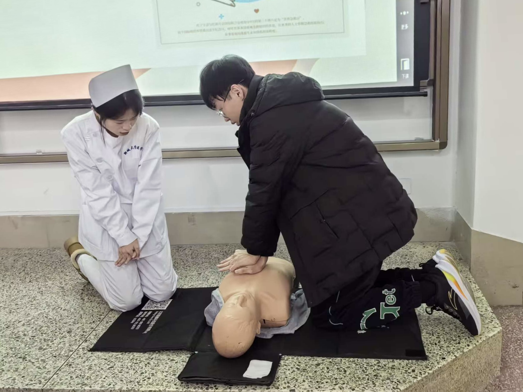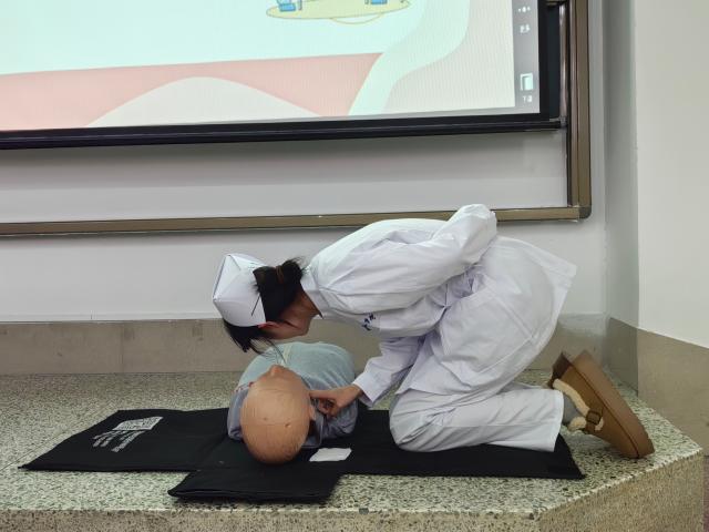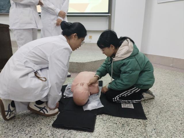 活动伊始,主讲人通过视频和PPT的形式详细讲解心肺复苏的正确步骤和标准的按压手法,讲解过程中,主讲人对现场员工进行简单急救知识提问,了解员工对急救知识的掌握情况。随后,主讲人讲解海姆立克急救法,介绍气道堵塞发生的原因、表现以及应对此问题的正确处理方法,队员进行现场演示。上台操作环节,队员利用假人模拟心脏复苏急救现场,从迅速判断现场环境是否安全,到准确判断患者有无意识、呼吸,再到标准规范的胸外按压手法,对各环节的操作流程和技术要领进行分步讲解和示范。实操练习过程中,员工积极踊跃上前操作,队员全程在旁悉心指导,及时纠正同学们操作中的错误,确保大家能更好掌握这一救命技能。