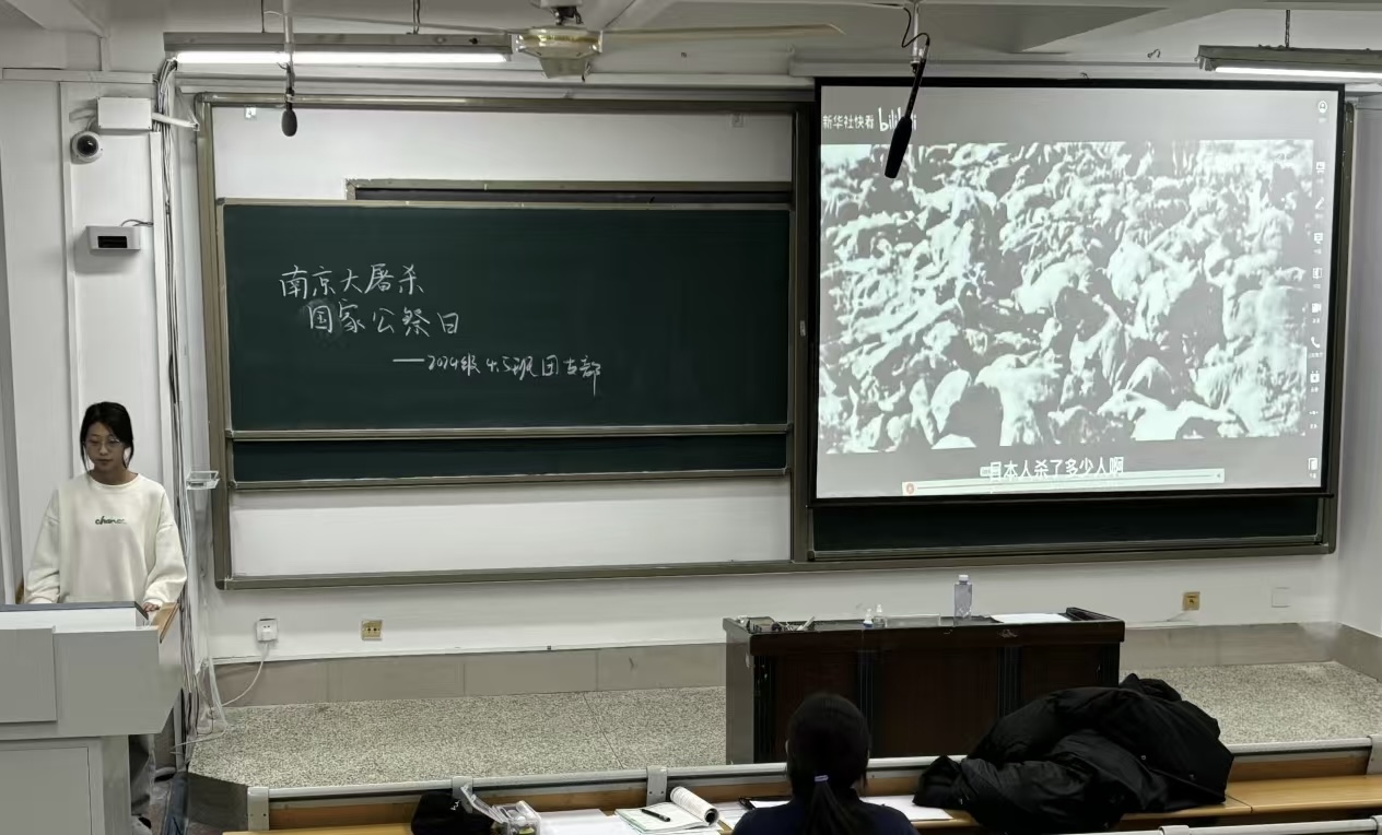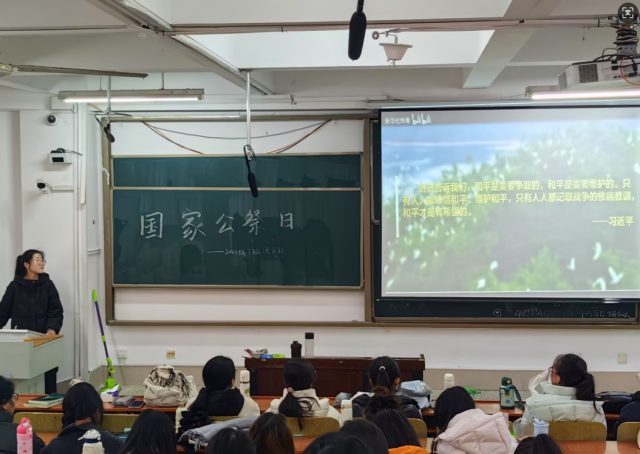 2024级4班于11号教学楼A204教室开展“勿忘国耻,振兴中华”国家公祭日主题团日活动,由团支书孙若琪主持。团课伊始,全场肃穆默哀一分钟,向遇难的30余万同胞致以沉痛哀悼,气氛凝重悲怆。随后,以影像资料深度还原那段惨绝人寰的历史:日军暴行下,南京城生灵涂炭、哀鸿遍野,血腥场景震撼着在场每一位同学的心灵,侵略者的罪恶铁证如山,不容置疑与忘却。活动尾声,员工宣誓,誓言铿锵有力,“勿忘国耻,振兴中华”的呼声响彻教室,彰显出青年群体捍卫历史真相、勇担时代使命的坚定决心。此次团课强化了员工对国家公祭日的认知,激励莘莘学子将悲愤化作前行力量,为中华民族伟大复兴矢志拼搏。