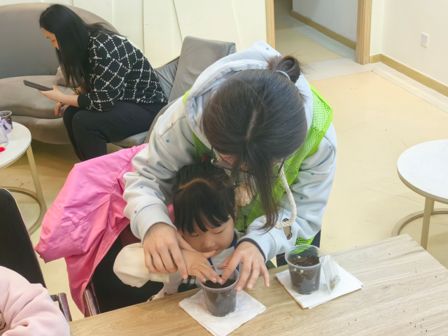 志愿者通过一段精彩的植物纪录片让孩子们跟随镜头探索植物的多样性,感受大自然的神奇;通过互动问答,引导孩子们思考植物生长的奥秘,现场气氛热烈。随后,志愿者借助生动有趣的ppt与实物土壤样本,向孩子们介绍了植物的生长要素,如光照、水分和土壤;并通过“土壤大侦探”问答游戏,让孩子们观察沙质土、黏质土的区别,加深他们对科学知识的理解。最后,孩子们化身“小小园艺师”,在志愿者指导下进行填土、播种、浇水,用彩色画笔和贴纸为花盆绘制卡通图案,创作出“彩虹小窝”“星星花园”等充满童趣的盆栽,并赋予它们独特的名字。整个过程充满了欢声笑语,让孩子们在欢乐中学习,在实践中成长。