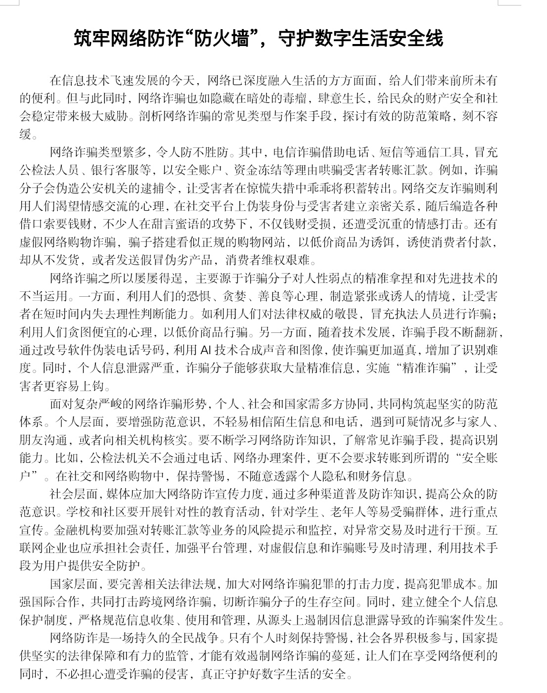 活动围绕“网络防诈骗”主题,面向全校员工征集文章、图片及绘画等创意作品。在文章类作品中,参与者结合真实案例,从诈骗手段、心理陷阱、法律后果等角度展开深度剖析,提出具有实操性的防范建议;图片类作品中,参与者则以强烈的视觉冲击力传递反诈警示,突破传统构图,将“稳赚不赔”“免费担保”等典型诈骗话术碎片化拼贴,配合混乱的字体排版与冲突的色彩搭配,还原诈骗信息轰炸的压迫感,警示师生警惕“天上掉馅饼”的诱惑,或设计简洁醒目的标语与图标,直观传达防诈警示;绘画作品打破传统形式,运用漫画、插画、数字绘画等多种风格,通过场景化叙事还原诈骗过程。此次活动得到了同学们的积极响应,大家纷纷发挥自己的特长,创作出了一系列精彩纷呈的作品。