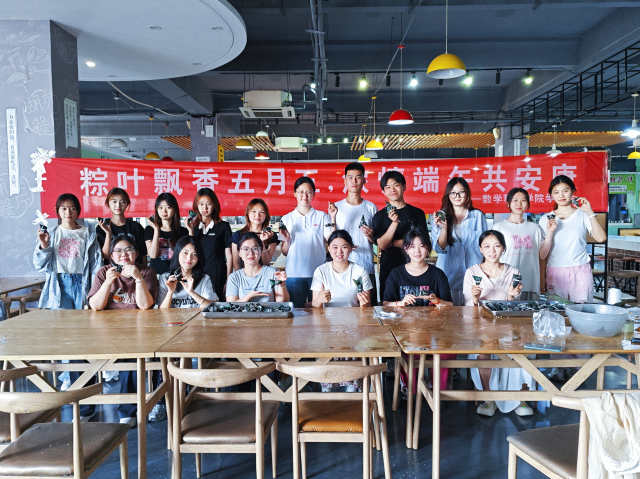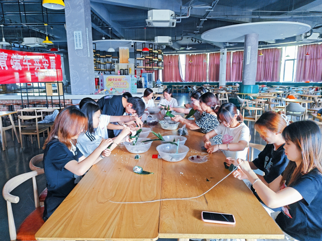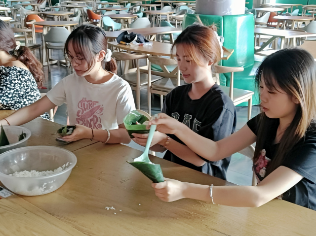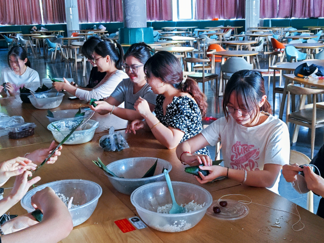 活动筹备阶段,工作人员分工明确,提前采购了糯米、蜜枣、粽叶等丰富的食材以及包粽子所需的各类工具,为活动的顺利开展做好充分准备。活动现场,同学们纷纷围聚在摆满食材的桌前,经验丰富的同学主动分享包粽子的技巧,耐心地为其他同学讲解和示范,他们认真观察手法、模仿技巧,小心翼翼地将粽叶折成漏斗状,并放入适量糯米,接着点缀上馅料,覆盖一层糯米压实,最后用棉线灵巧地缠绕、打结,一个个形态各异的粽子逐渐成型。当粽子在锅中散发出阵阵清香时,同学们迫不及待地品尝起自己的劳动成果,软糯的糯米混合着粽叶的清香与馅料的甜蜜在舌尖散开,现场洋溢着欢乐与满足的氛围。