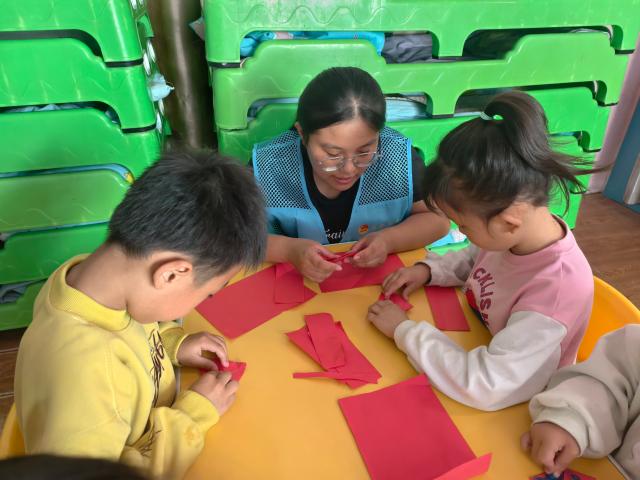活动伊始,志愿者以“保护大家的英雄”为主题,通过播放烈士事迹视频,搭配生动有趣的语言讲解,让小朋友们初步感受英雄烈士的勇敢精神与奉献情怀。随后,志愿者化身“红色故事讲解员”与“童心陪伴者”,手持绘有英烈小故事的绘本,向小朋友们讲述英雄事迹,并带领小朋友们齐唱改编版的红色童谣,欢快的旋律中传递出崇敬之情。接着,志愿者把提前准备好的彩纸、胶棒等工具分发给小朋友们,并手把手地指导大家制作“小红花”,一朵朵鲜艳的“小红花”,成为小朋友们致敬英雄的专属礼物。最后,小朋友主动分享自己的感受,志愿者们为积极参与的小朋友们送上小奖励,让红色记忆伴着笑容定格。