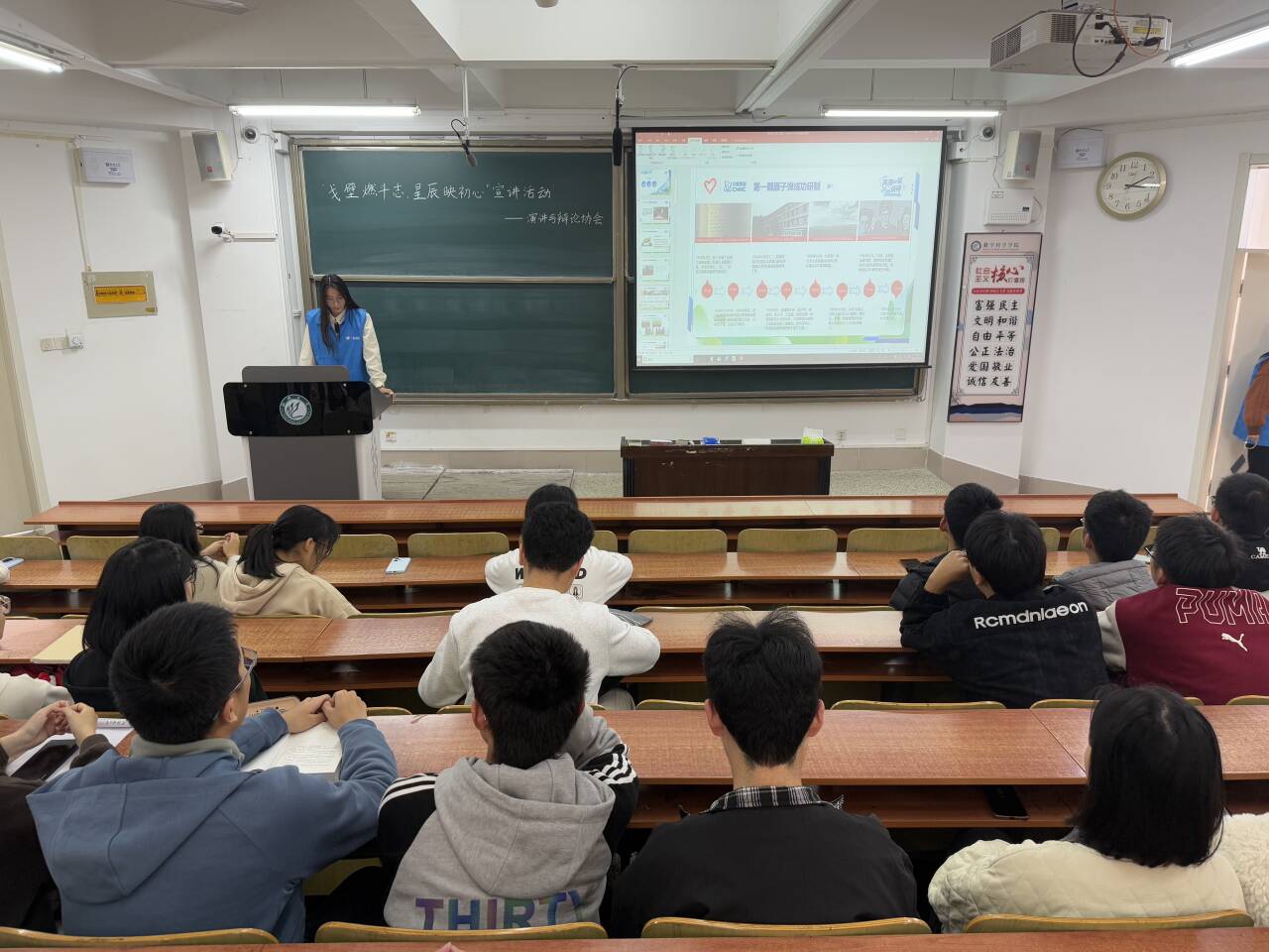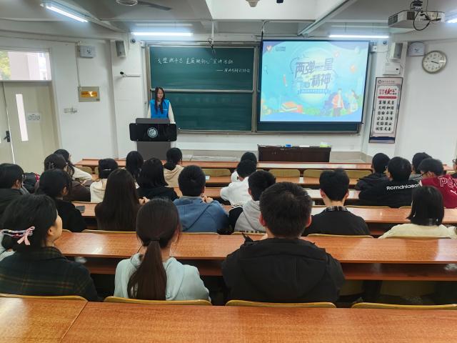 本次宣讲以“两弹一星”精神为主题,带领同学们追忆科技工作者隐姓埋名、扎根戈壁的光辉事迹,解读“热爱祖国,无私奉献,自力更生,艰苦奋斗,大力协同,勇于登攀”二十四字精神内涵。活动伊始,主讲人以我国第一颗原子弹的研制历程为切入点,结合珍贵的历史资料与鲜活的人物故事,详细讲述了两弹一星事业从艰难起步到辉煌突破的奋斗历程,让同学们在沉浸式聆听中,深刻感受到两弹一星事业从一无所有到铸就磅礴力量的伟大征程。宣讲过程中,从邓稼先主导原子弹理论设计,到郭永怀在核航弹试验中牺牲,再到于敏提出氢弹构型方案,王淦昌领导地下核试验,一个个感人至深的事迹,让在场同学深刻感受到了先辈们为两弹一星事业所作出的伟大贡献。活动最后,同学们表示未来将以先辈们为标杆,在学习和生活中践行爱国奉献、砥砺奋进的精神,努力成长为可堪大用、能担重任的时代新人。