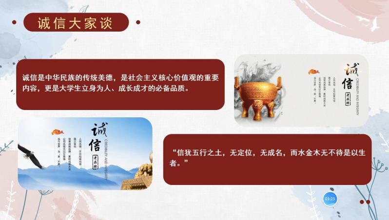 本次活动以“心间存感激,视频传浓情”为主题,同学们通过网络搜索和查阅资料等方式,深入了解当前高校的诚信现状以及员工典型的感恩事例,创造出主题明确、内容充实、通俗易懂的优秀作品。视频中呈现的小故事及同学们对感恩诚信的感悟性发言,既诙谐幽默,又寓教于乐地阐释了诚信的内涵,强调了诚信感恩的重要意义,充分体现了悟空体育员工的道德修养和青春朝气。本次活动以视频为载体,向同学们传递正向价值、传播诚信文化的同时,进一步明确了讲诚信的重要性。活动最后,组织者将视频作品收集整理并评选,对优秀作品进行展示。