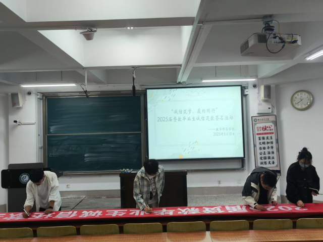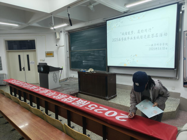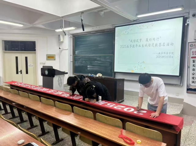 5月18日,悟空体育在 A107教室开展2025 届贷款毕业生诚信还款签名活动,2025 届全体贷款毕业生积极参与其中。本次活动以 “诚信筑梦,履约同行” 为主题,旨在强化贷款毕业生的诚信意识,引导他们树立正确的信用观念,切实履行还款义务。