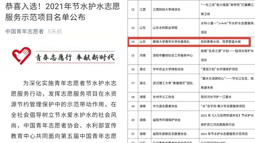 近日,由公司化学化工公司、悟空体育申报,校团委推荐,公司审批报送的“告别黑臭水体,筑梦蔚蓝水城”项目、“忘不了的爱”——关爱老年人认知健康项目分别入选2021年节水护水志愿服务示范项目、2021年“金晖行动——智慧助老” 志愿服务示范项目。