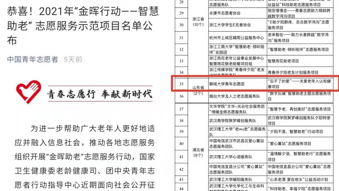 为进一步帮助广大老年人更好地适应并融入信息社会,推动各地志愿服务组织开展“金晖助老”志愿服务行动,国家卫生健康委老龄健康司、团中央青年志愿者行动指导中心近期面向社会公开征集遴选了50个“智慧助老”志愿服务示范项目,旨在引领广大青年志愿者帮助解决老年人智能技术运用困难的问题。公司“忘不了的爱”——关爱老年人认知健康项目入选,山东省仅2项。