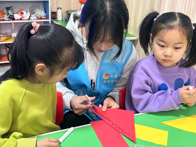 志愿者用生动有趣的语言向小朋友们介绍了纸鸢的起源、用途等相关知识,并将准备好的彩纸、剪刀、彩笔等材料一一分发下去,详细地讲解了简易纸鸢的制作过程,小朋友们跟随志愿者的指导,一步步地制作着属于自己的纸鸢,从小心翼翼地裁剪纸张到在纸上绘画出五彩斑斓的图案,再到仔细地粘贴各个部件,每一个步骤都充满了乐趣。在欢乐的氛围下,一个个独一无二的纸鸢逐渐成型,小朋友们在实践中不仅感受到了手工创作的趣味,还加深了对中华优秀传统文化的理解。