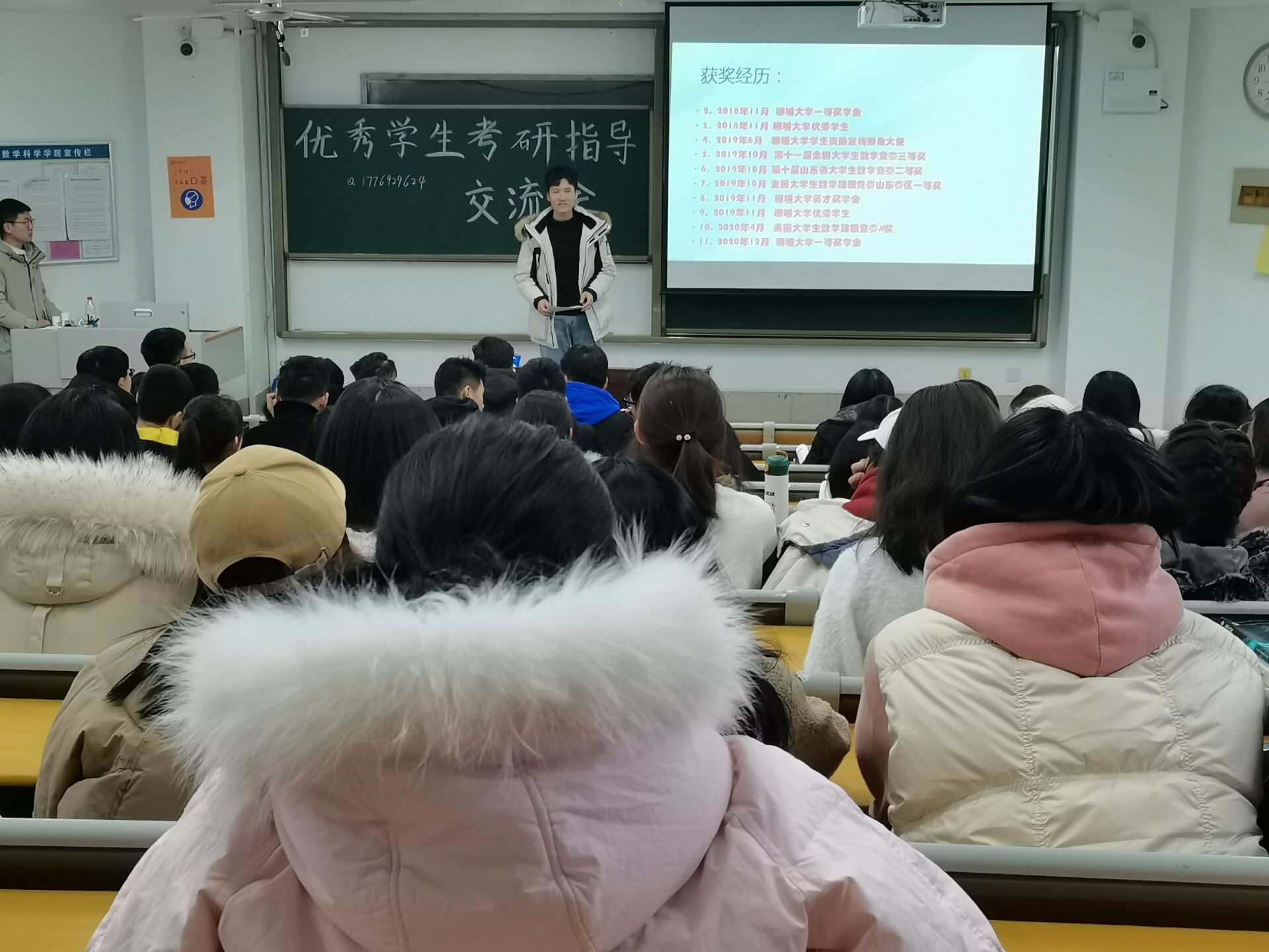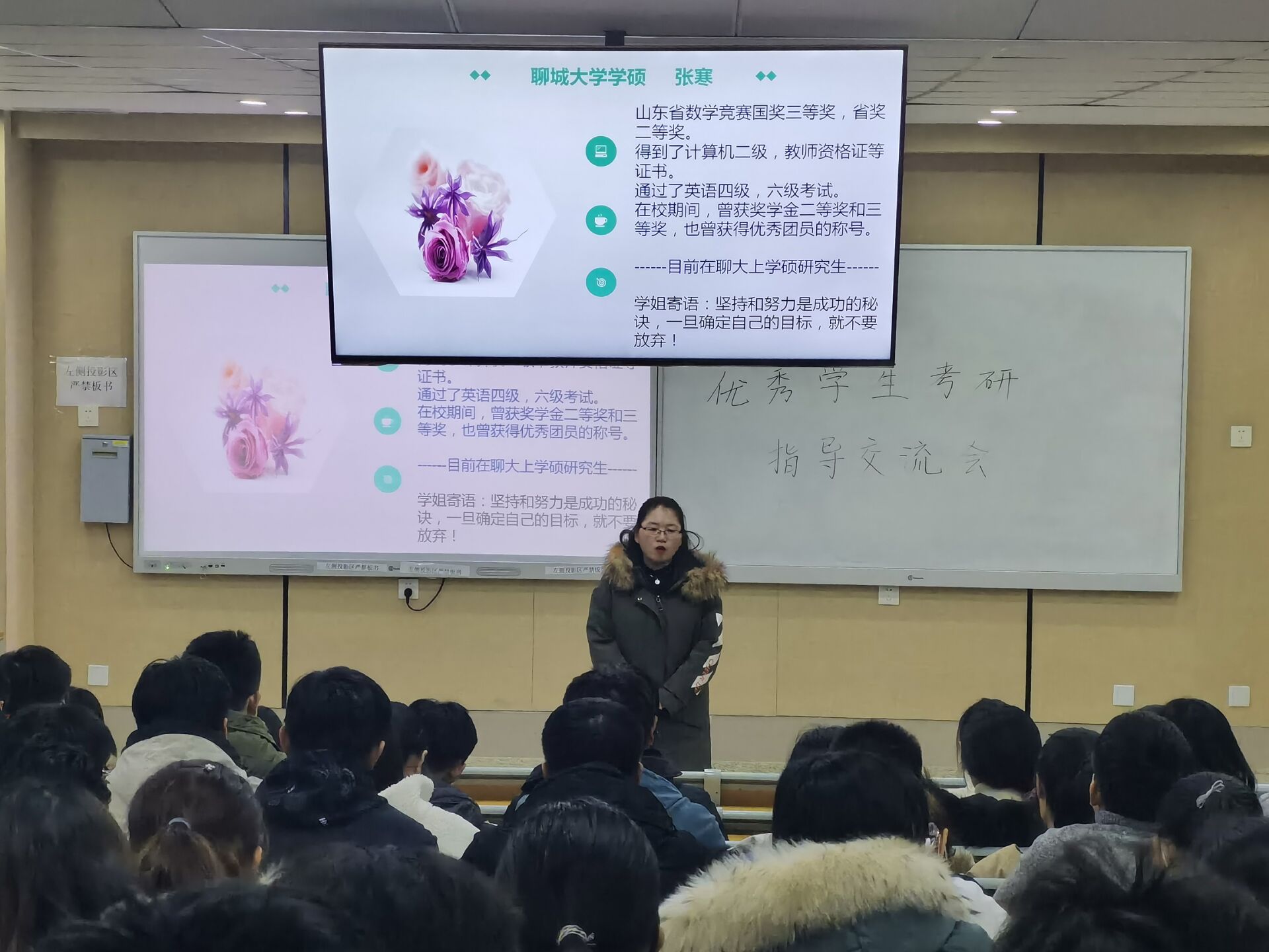活动伊始,负责人首先对几位优秀毕业生的学位背景进行了简单的介绍,紧接着又对在场同学强调了此次活动的目的及其意义,听取他人的故事,能更好的丰富自己的老员工活。在热烈的掌声中,第一位优秀毕业生走上讲台。她脸上洋溢着自信的笑容,将自己与聊大的故事娓娓道来,她提到大学是一个不怕孤独的过程,考研之路更是如此,要坚定自己的梦想,在书籍中去寻找快乐;不必滥交好友,要交志同道合的朋友。她还提到了坚持与勤奋的重要性,所谓“星光不负赶路人”,即使求学路上荆棘遍布,只要永不言弃,就一定能收获丰硕果实。演讲者声情并茂,台下观众也沉浸其中,连连点头拿出本子认真记录。演讲者一个接着一个走上讲台,掌声一阵高过一阵。突然全场发出了赞叹声,未见其人也未听其声,只看见投影屏幕上跳动的字符,原来是最后一名演讲者达到了所有数学科目接近满分的成绩。在全体观众的热情欢呼下,此位毕业生为大家分享了自己的学习方法,幽默诙谐的语言加上适当的板书,使同学们沉浸在他的讲解中,也将此次活动推向了高潮。最后活动负责人对此次活动做了总结,并且对在场优秀毕业生的到来表示了诚挚的感谢,到此活动圆满结束。