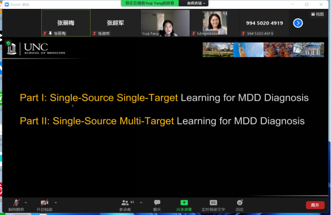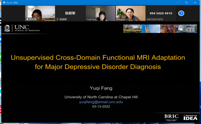2022年3月13日(星期日)上午九点,受悟空体育智能数据分析团队邀请,北卡罗来纳大学教堂山分校房钰棋博士后在线上做了关于Unsupervised Cross-Domain Functional MRI Adaptation for Major Depressive Disorder Diagnosis 的学术报告,除智能数据分析团队的全部教师和研究生参加以外,本次会议也邀请了其他高校的老师和员工参加,在会议中师生们进行了精彩的发言讨论。