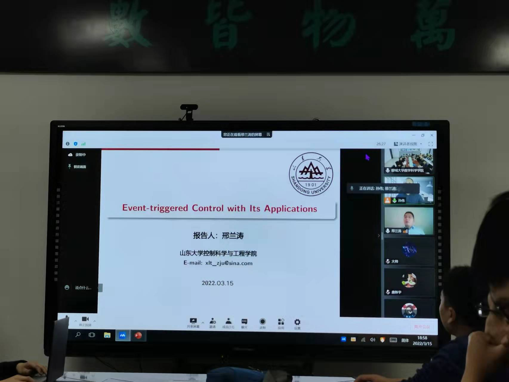 2022年3月15日(星期二)晚上七点,山东大学邢兰涛教授应邀在公司B207会议室作了题为 “Event-triggered Control with Its Applications” 的学术报告。此次报告由悟空体育孙伟副教授主持,公司复杂系统智能分析与控制团队的老师和研究生以及其他高校的老师和员工参加了本次报告会。