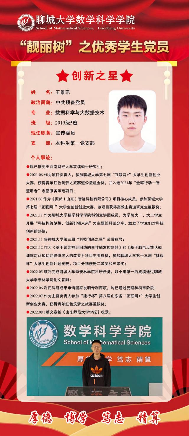 “靓丽树” | 亮出党员身份 争做先进标杆——创新之星 发布时间: 2022-11-12 为进一步发挥党员先锋模范作用,强化党员意识,铭记党员身份,履行党员义务。公司开展了以“亮党员身份、立先进标杆、树先锋形象”为主要内容的“靓丽树”活动,激励全体党员在新的奋进之路上,勇于担当、锐意进取、干事创业、攻坚克难,以接力跑的姿态带领全院师生紧握时代赋予的“接力棒”,锚定前进方向,笃定前行速度,铆足实干动力,在新赛道上奋力奔跑出数学“加速度”。