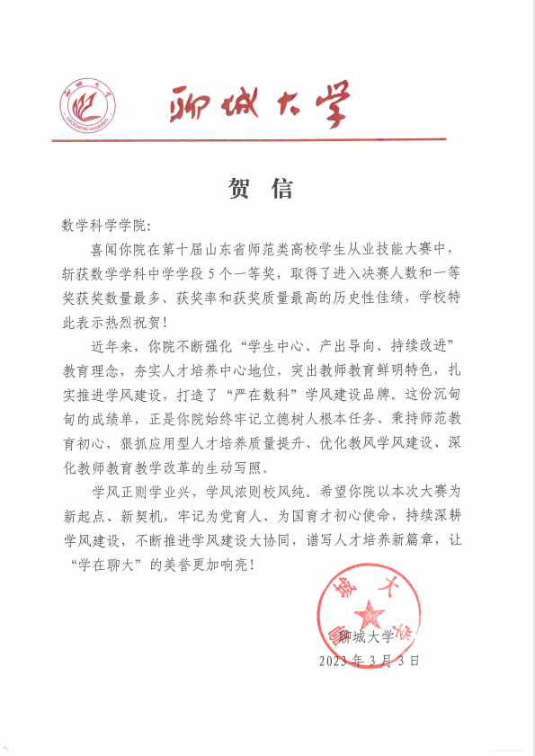 近日,公司向公司发来贺信,向公司在第十届山东省师范类高校员工从业技能大赛中,斩获数学学科中学学段5个一等奖,取得了进入决赛人数和一等奖获奖数量最多、获奖率和获奖质量最高的历史性佳绩,表示热烈祝贺!