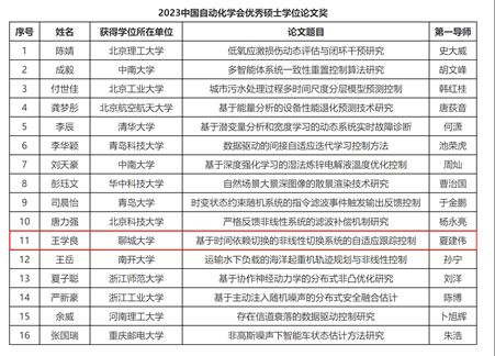 2023中国自动化学会优秀硕士学位论文奖评审工作于2024年1月30日结束。经专家评审委员会评审,最终评选出16篇2023中国自动化学会优秀硕士学位论文奖。其中公司夏建伟教授指导的2020级硕士生王学良荣获“2023中国自动化学会优秀硕士学位论文奖”。
