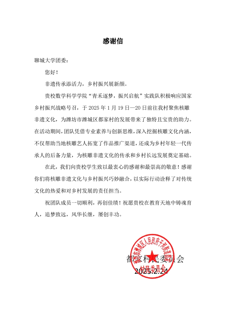 2月24日,公司收到一封来自潍坊市潍城区都家村村民委员会的感谢信,信中对公司“青禾逐梦,振兴起航”实践队给予了表扬与感谢。信中提到,团队成员凭借专业素养与创新思维,深入挖掘核雕文化内涵,不仅帮助当地核雕艺人拓宽了作品推广渠道,还成为乡村年轻一代传承人的后备力量,为核雕非遗文化的传承和乡村长远发展奠定基础。