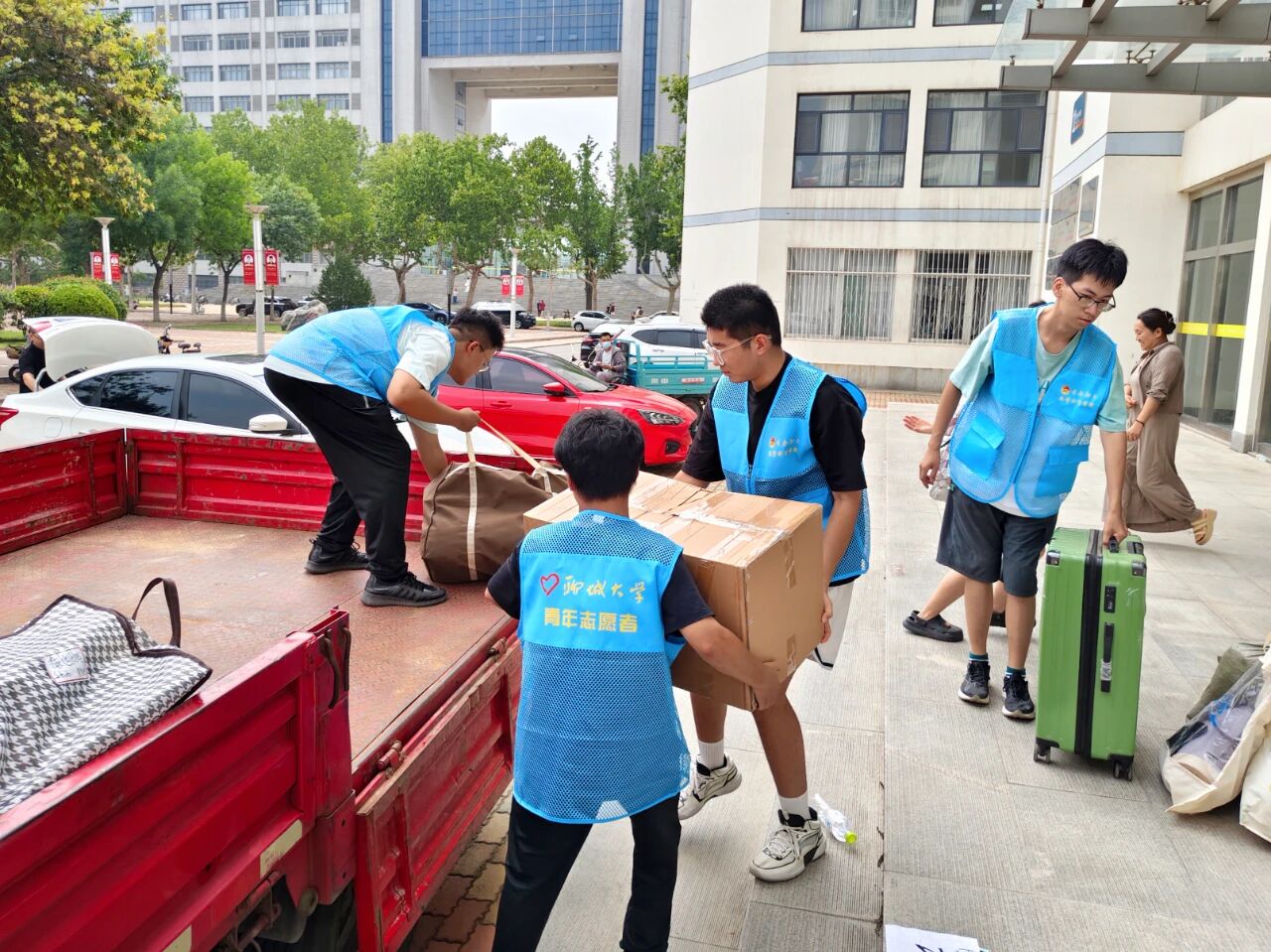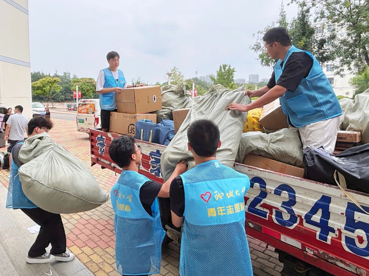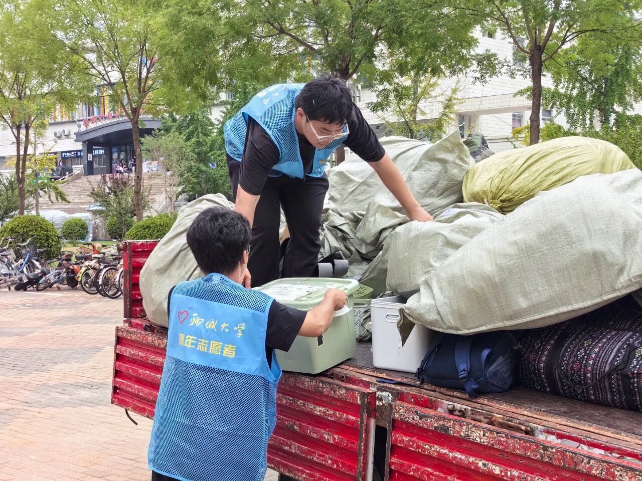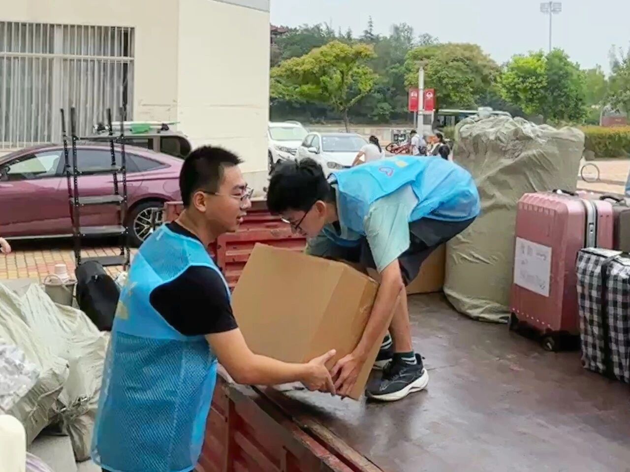 活动前期,公司提前规划路线,划分服务区域,在教学楼、宿舍楼入口处设置“志愿服务岗”。志愿者身穿蓝色马甲分工明确、相互协作,倾注爱心与奉献,反复往返于教学楼与宿舍楼之间,全力确保搬运行李工作顺利有序进行。从教学楼到宿舍楼,从装车到托运,志愿者们或搬运沉重包裹,或耐心打包零散物品,搭建起校园内的爱心运输线,他们热情地帮助员工搬运行李,用实际行动展现着雷锋精神,用汗水诠释着“奉献、友爱、互助、进步”的志愿服务精神。