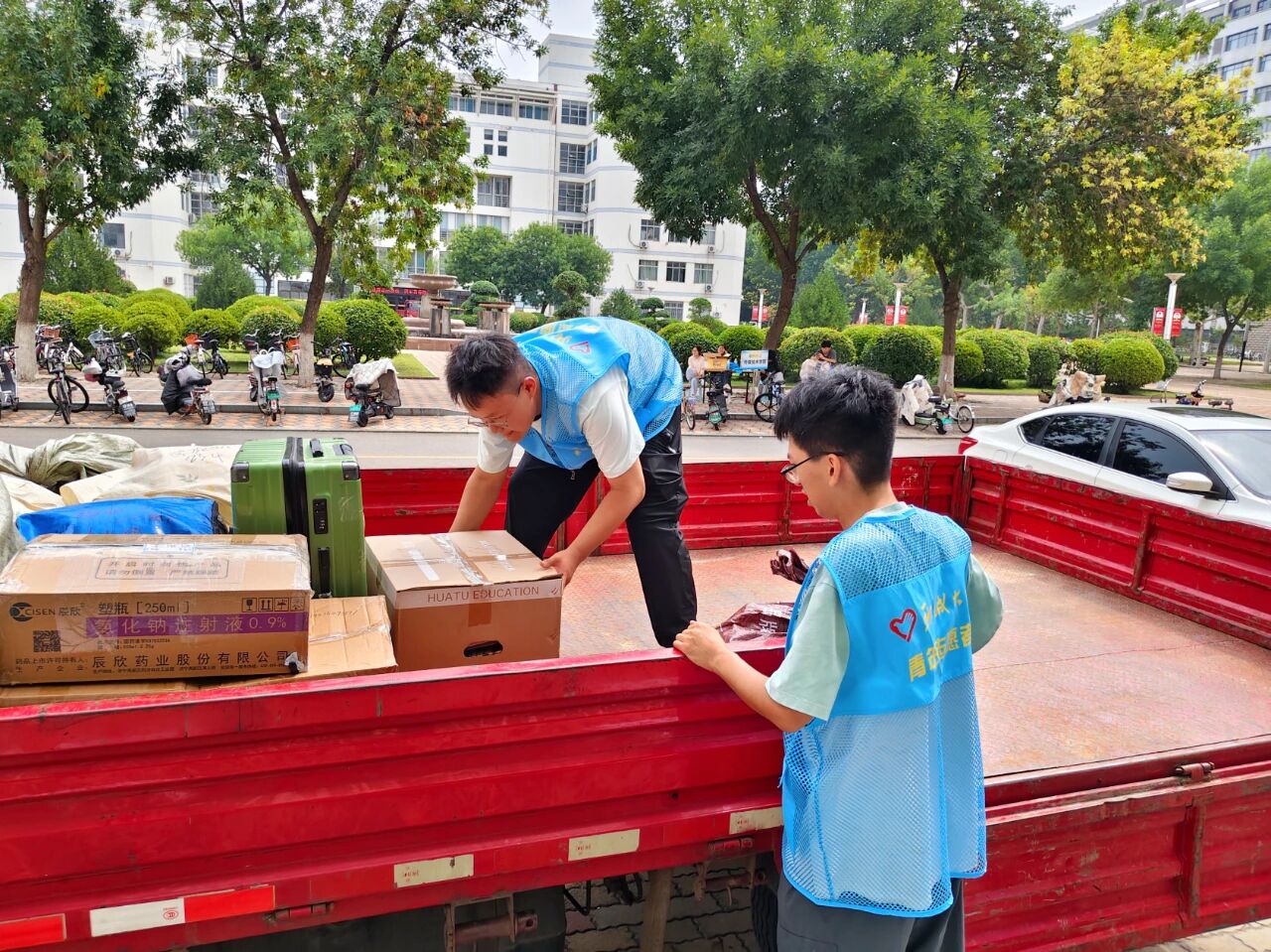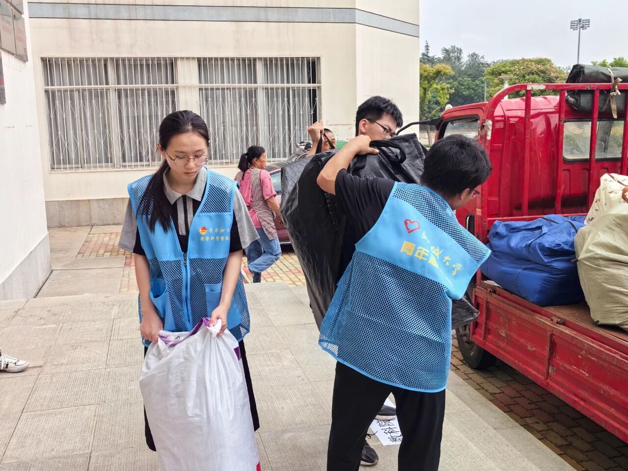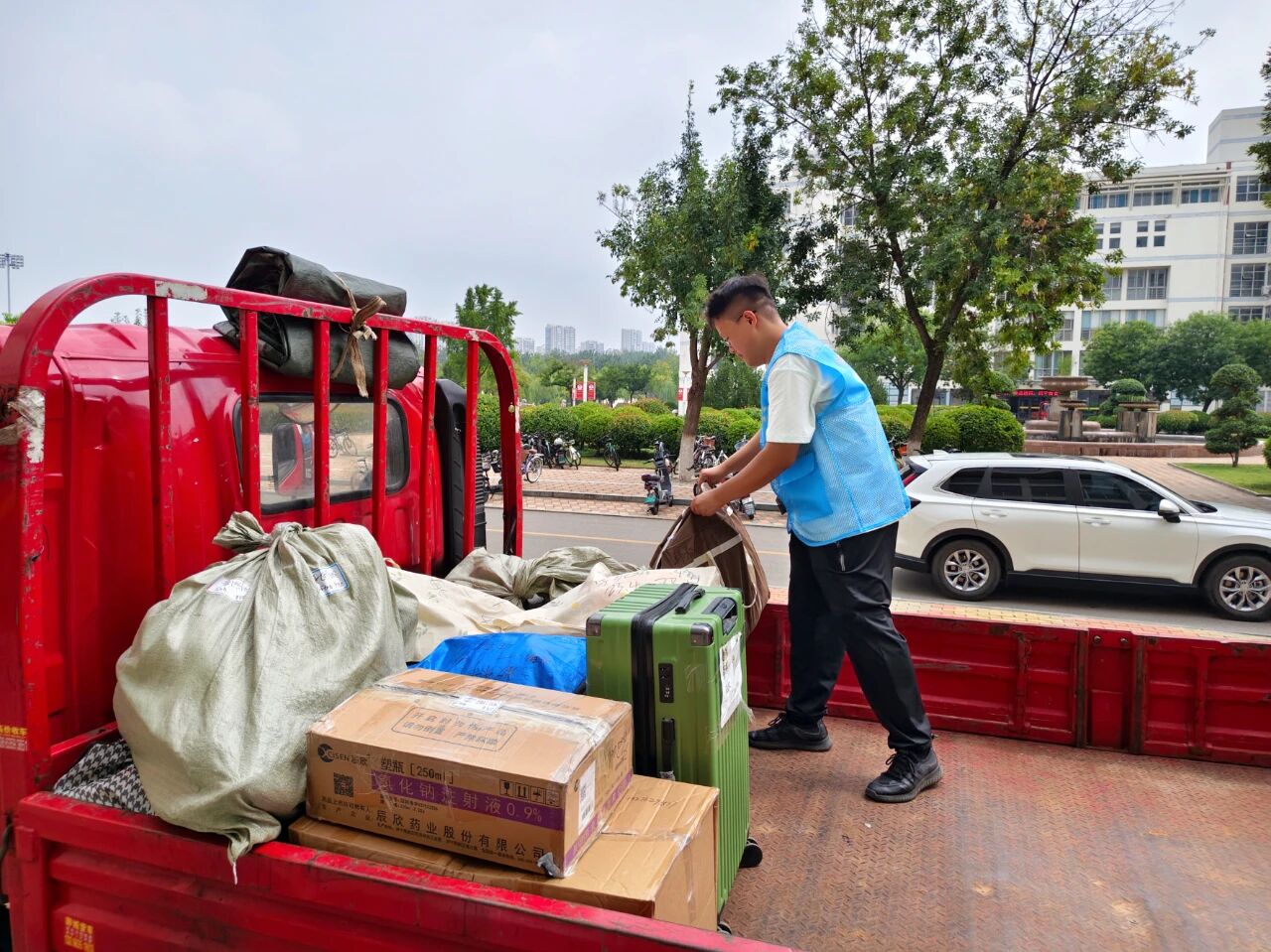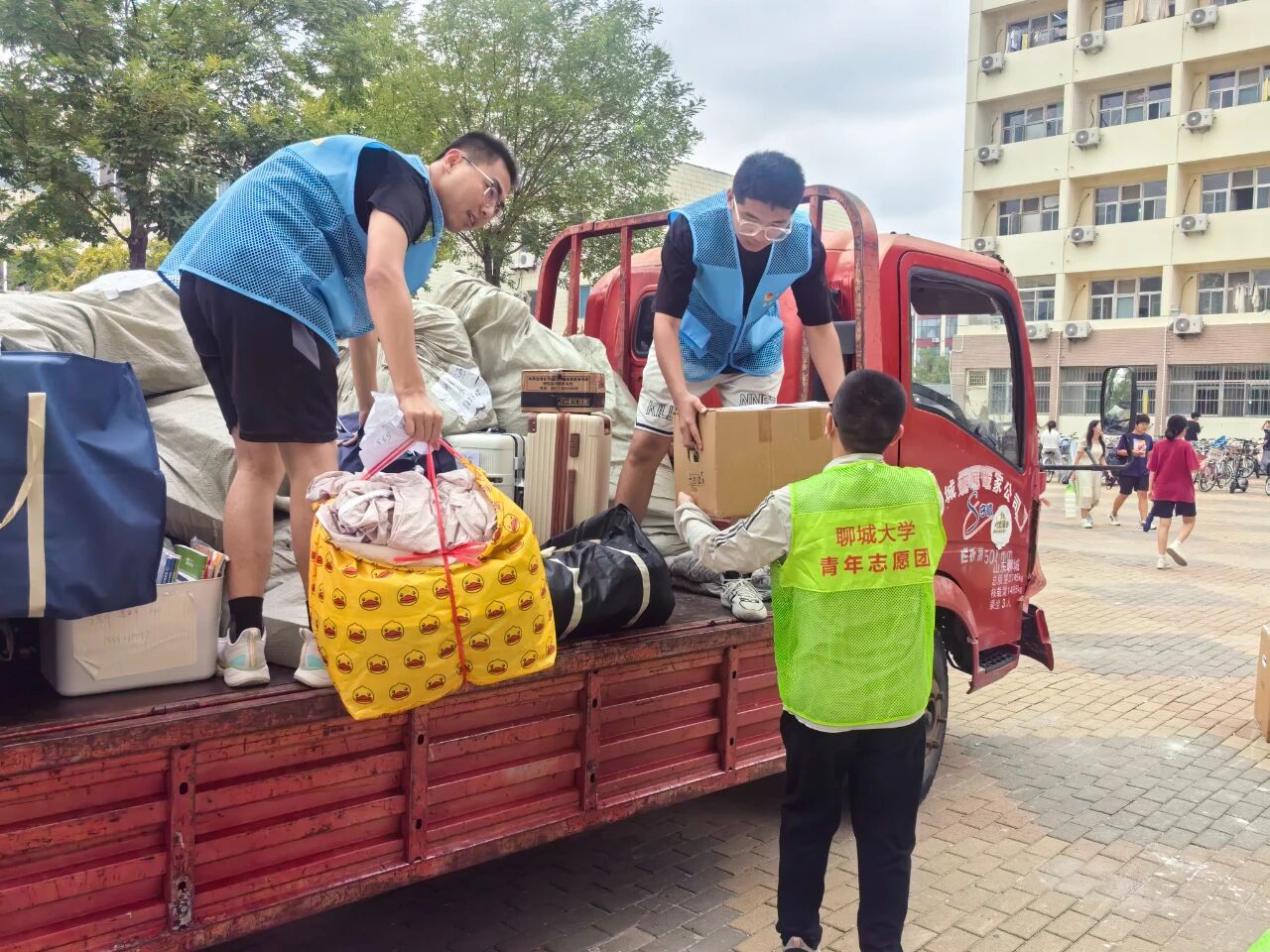 活动前期,公司提前规划路线,划分服务区域,在教学楼、宿舍楼入口处设置“志愿服务岗”。志愿者身穿蓝色马甲分工明确、相互协作,倾注爱心与奉献,反复往返于教学楼与宿舍楼之间,全力确保搬运行李工作顺利有序进行。从教学楼到宿舍楼,从装车到托运,志愿者们或搬运沉重包裹,或耐心打包零散物品,搭建起校园内的爱心运输线,他们热情地帮助员工搬运行李,用实际行动展现着雷锋精神,用汗水诠释着“奉献、友爱、互助、进步”的志愿服务精神。