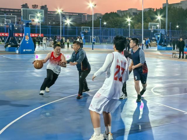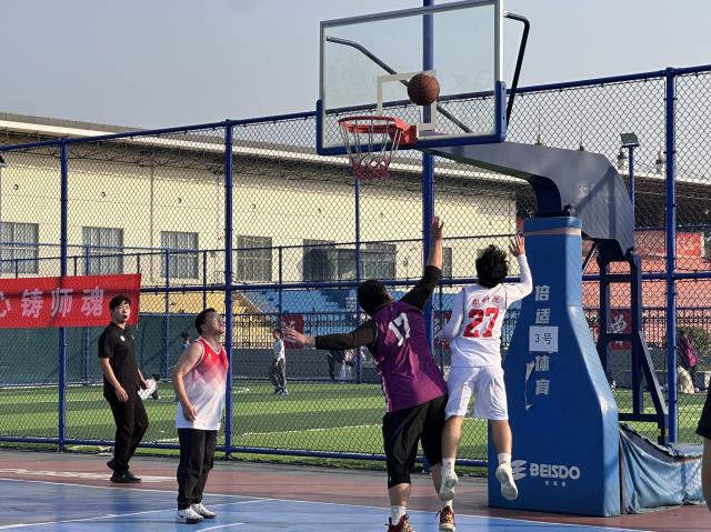 比赛开始前,老师们齐聚赛场,进行热身准备与战术沟通。比赛过程中,参赛教师在赛场上尽情挥洒汗水,展现出良好的精神风貌。运球、传球、投篮,一系列动作流畅自如;防守、盖帽、快攻,一幕幕精彩场面层出不穷。老师们全情投入,攻防转换,节奏分明。一方凭借精妙的团队配合,通过连续的挡拆掩护和运球跑动,创造出一次次绝佳的进攻机会;另一方则立足有序的防守体系,以准确的预判和积极的拼抢,屡次化解对方的攻势。各队配合默契,比分交替上升,现场气氛热闹非凡。本次友谊赛,既有战术层面的智慧博弈,也有个人能力的闪光时刻,更不乏相互击掌、彼此鼓励的温馨画面,充分体现出竞技体育与人文关怀的完美融合,展现出高尚的体育道德和强大的团队精神。