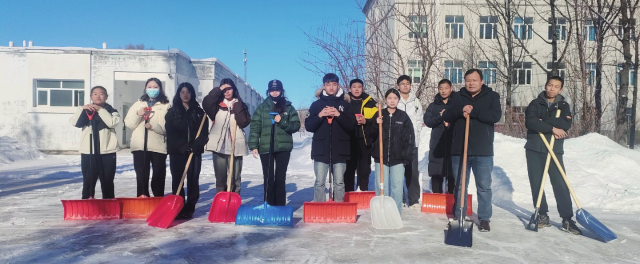 冬日里,陈铭意与员工们手持铲雪工具,在校园中开展扫雪活动,用行动诠释师生同心